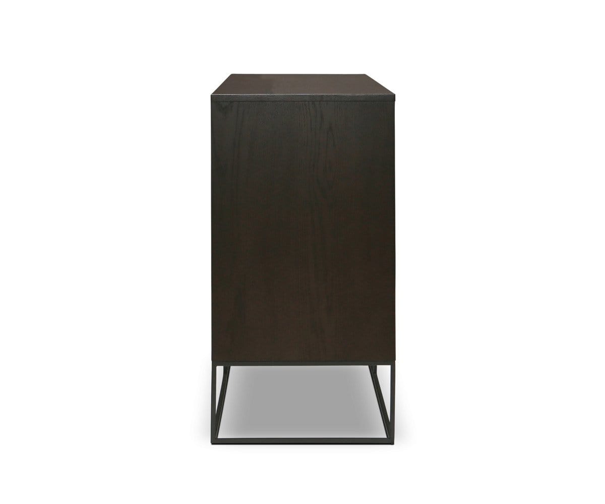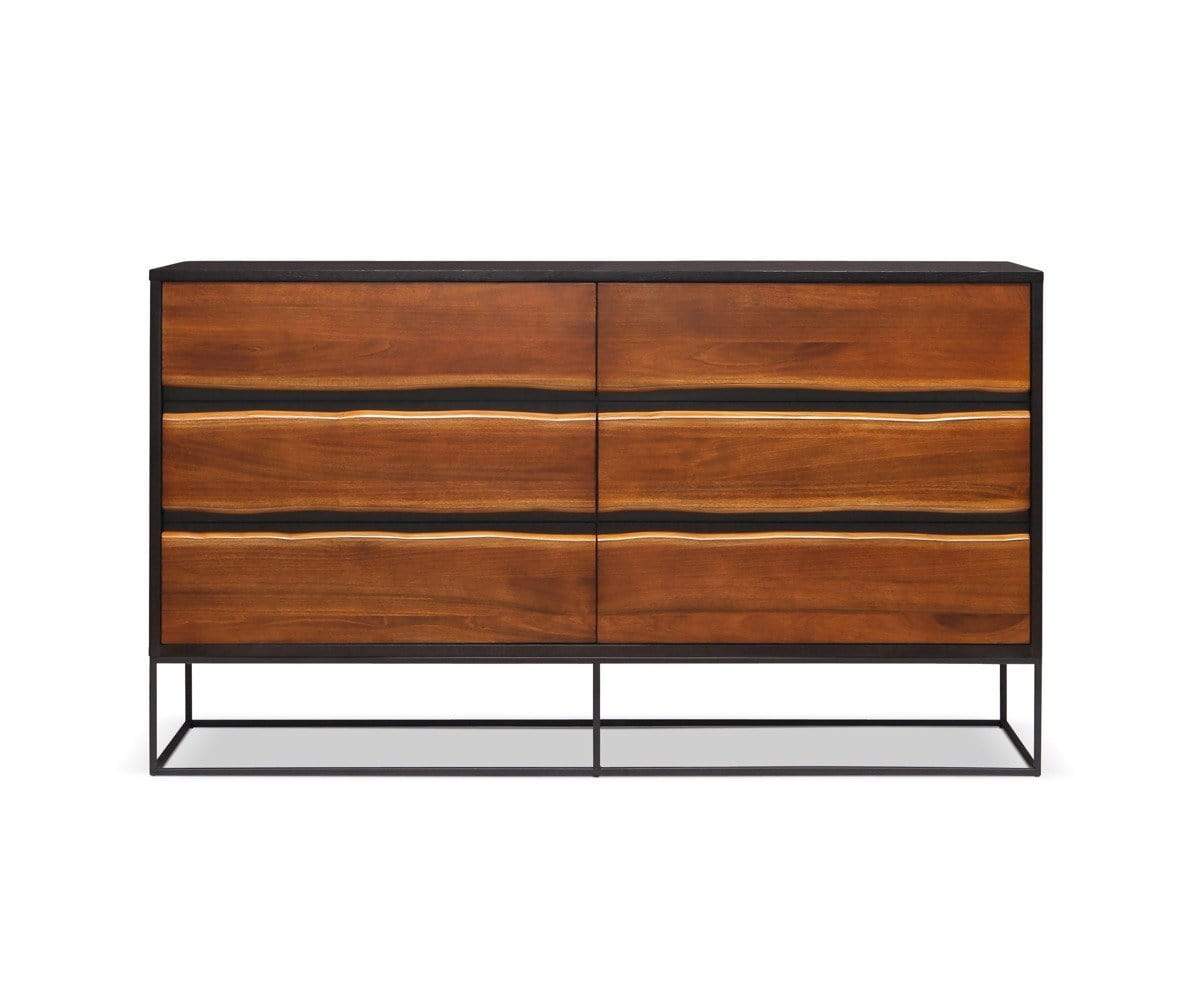 The Hasse double dresser features a dynamic profile and minimal detail with maximum storage space from six large drawers. A black metal base and solid American poplar wood frame and drawers create a rustic industrial look. A rich timber brown stain enhances the wood grain.