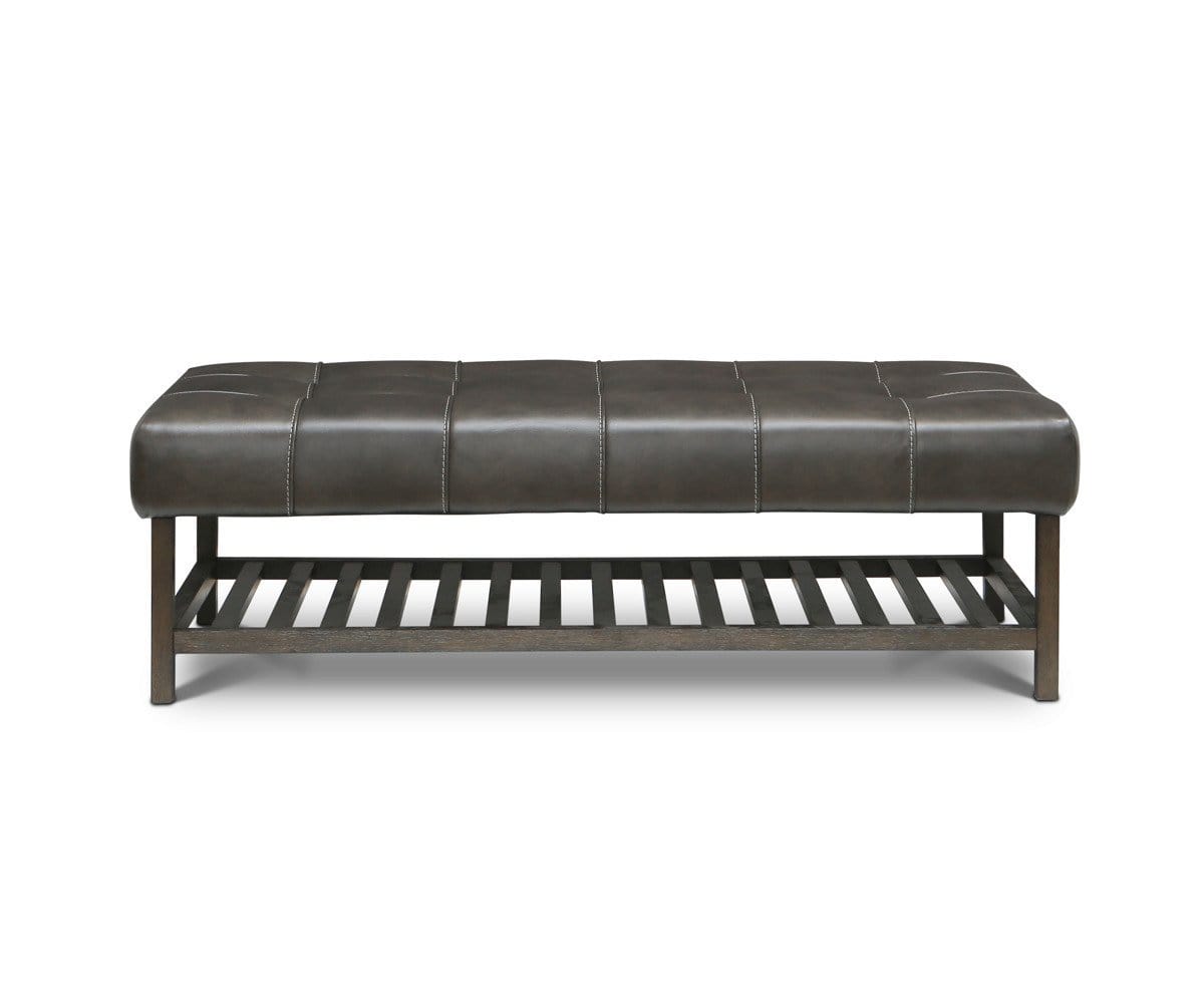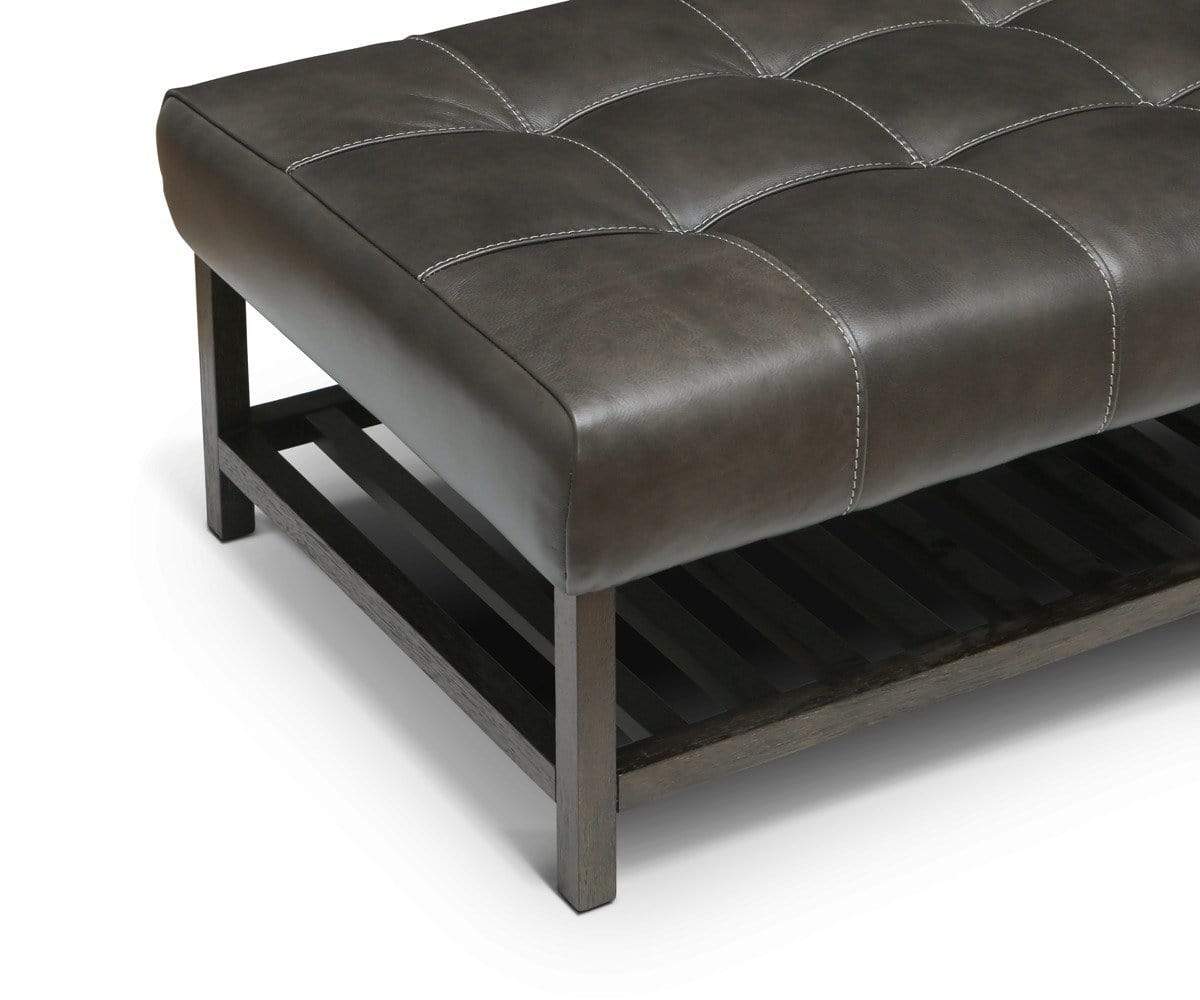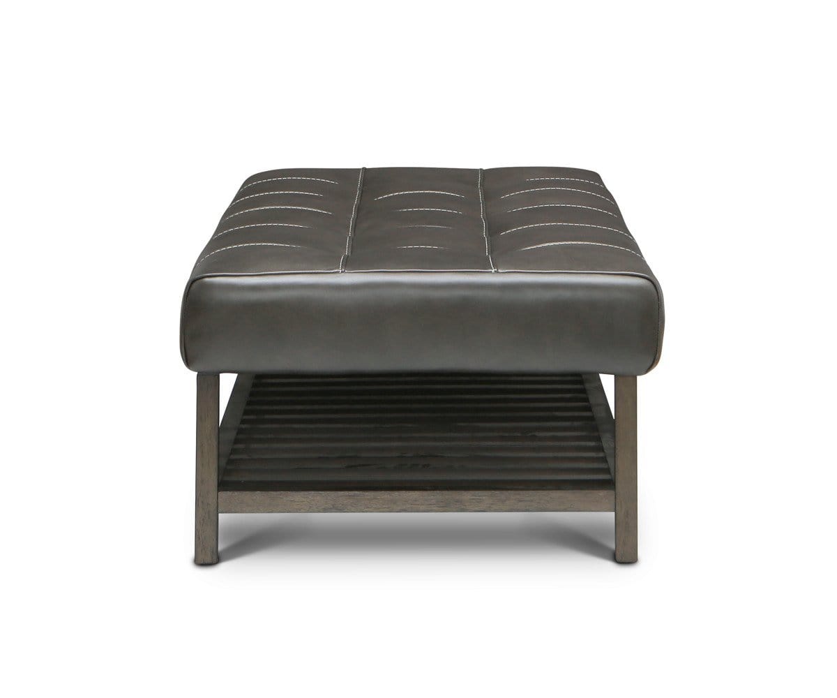 The Hauge ottoman with shelf will be the workhorse of your living room, bedroom or entry way. Use it as extra seating, a footrest, a coffee table or storage piece. The durably crafted base is finished with a rich venge stain. Tufted leather upholstery gives a luxe look.