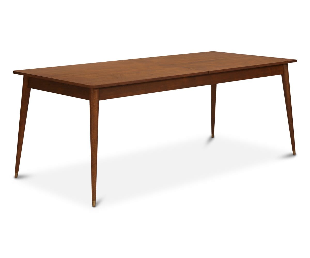 The Holfred extension table is a classic beauty. Enhance any dining area with the warm wood tones, smooth grain surface, clean lines, rounded corners and brass capped feet of this modern piece. Designed to extend in order to allow for more guests, it can transform your event from an intimate gathering to a formal affair.
