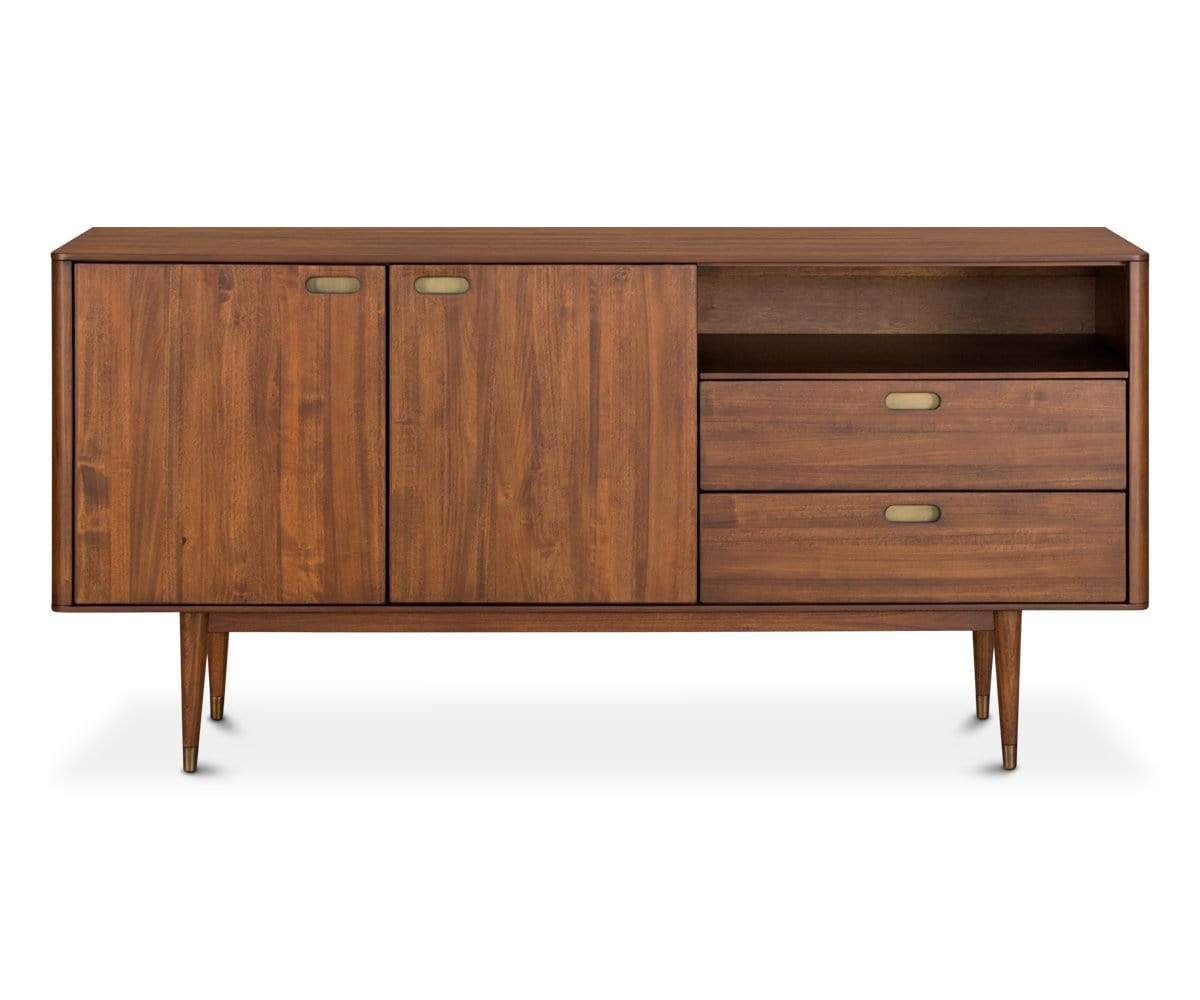 The Holfred sideboard is proof that functional furniture can be equally stylish and stunning. This piece masterfully blends all the most desirable design features into one - a large closed cabinet with shelving, two drawers, an open cubby and the long, sleek surface for display or additional open storage space. Warm tones in the smooth wood grain patterns flowing both horizontally and vertically create visual appeal, while the modern look is completed by the minimal, tapered legs with brass capped feet.