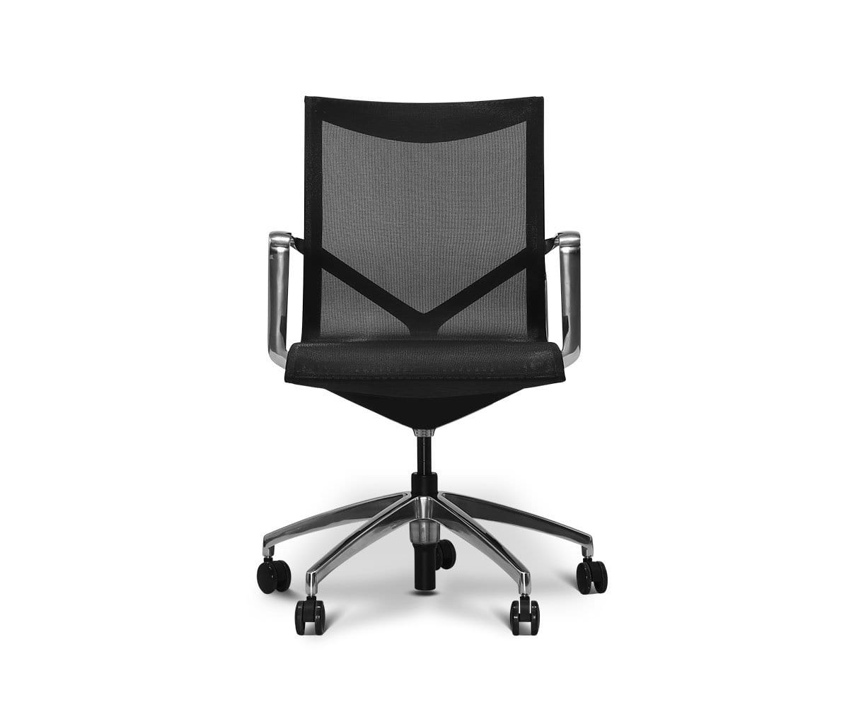 The Innri low back office chair promotes comfort and productivity. The low backrest is made from breathable mesh to keep you cool under pressure. Ergonomic considerations in the seat and armrests provide reliable support. A leather seat complements the chromed metal frame. This height-adjustable chair features rolling casters for easy mobility.